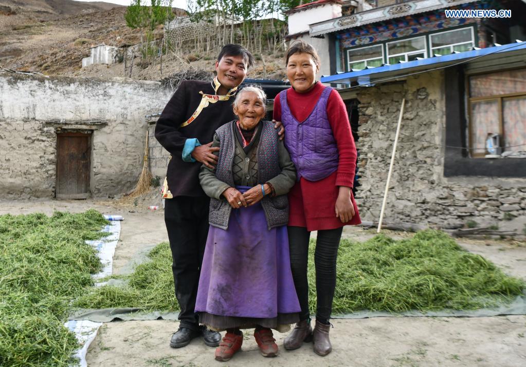Tsering Yangzom (C) poses for a photo with her son and daughter at Qoide'og Village in Nedong County of Shannan City, southwest China's Tibet Autonomous Region, June 3, 2021. Tsering Yangzom, 87, was a serf and lived under cruel feudal serfdom before the democratic reform in Tibet. Tsering Yangzom was born to a family of serfs, and could never forget the difficult times when her family had no choice but to feed on leftovers of better-off households. "My parents brought me to this world, but my life belonged to the serf owner just like them," she recalled. The democratic reform in 1959 freed Tsering Yangzom from serfdom. She was provided with farmland and livestock. When the Sino-Indian border conflict broke out in 1962, Tsering Yangzom immediately signed up for the logistics and transportation team and followed the People's Liberation Army all the way to the front line, defending the hard-won freedom. "Now I don't have to worry about food, clothing and shelters anymore," Tsering Yangzom said, "I intend to live a long happy life." (Xinhua/Jigme Dorje)