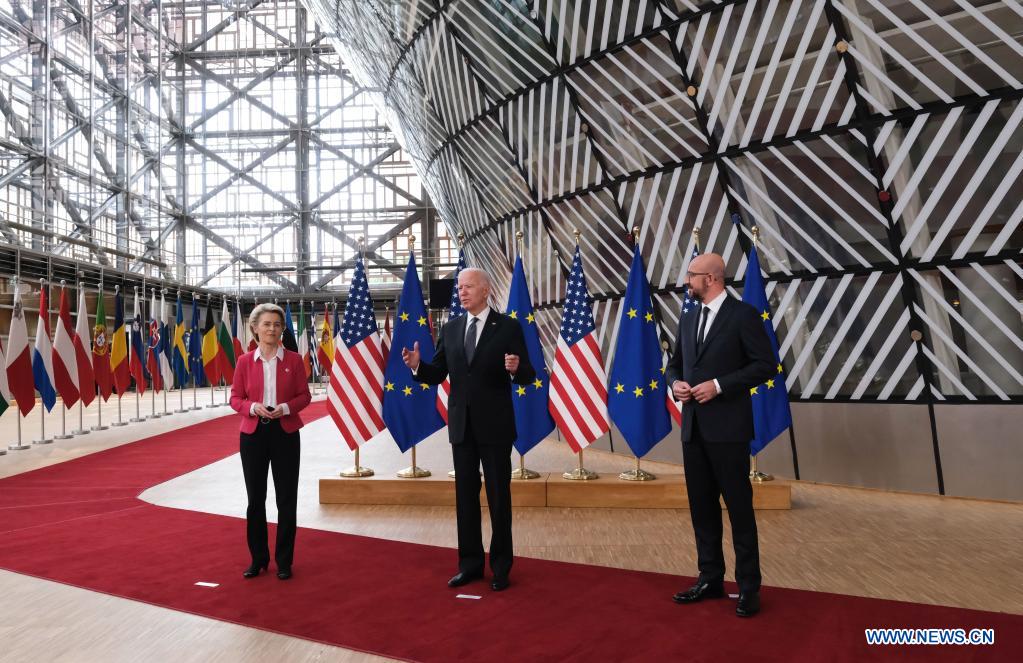 European Council President Charles Michel (R) and European Commission President Ursula von der Leyen (L) welcome U.S. President Joe Biden (C) at the EU headquarters in Brussels, Belgium, on June 15, 2021. The European Union (EU) and the United States held their first summit in seven years on Tuesday as U.S. President Joe Biden was on his first overseas trip since taking office to revamp the transatlantic ties. (European Union/Handout via Xinhua)