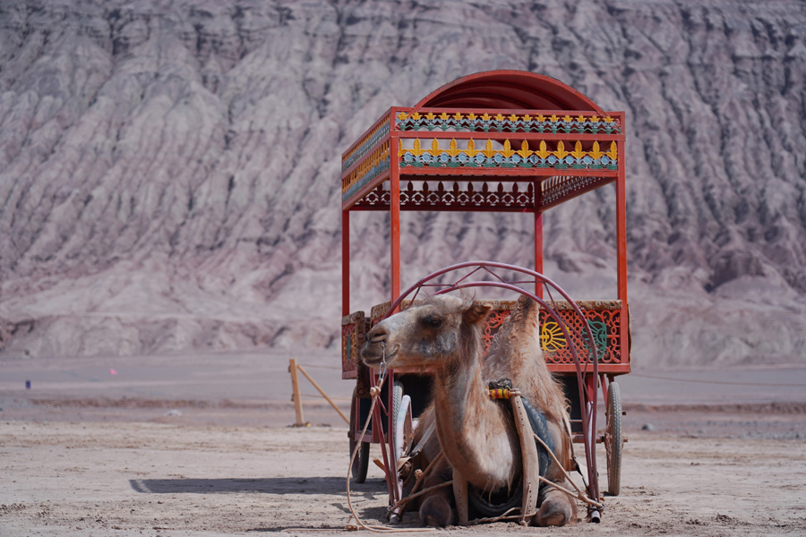 A camel rests at the Flaming Mountain scenic spot in Turpan, northwest China's Xinjiang Uygur Autonomous Region, May 28, 2021. (People's Daily Online/Zhang Ruohan)