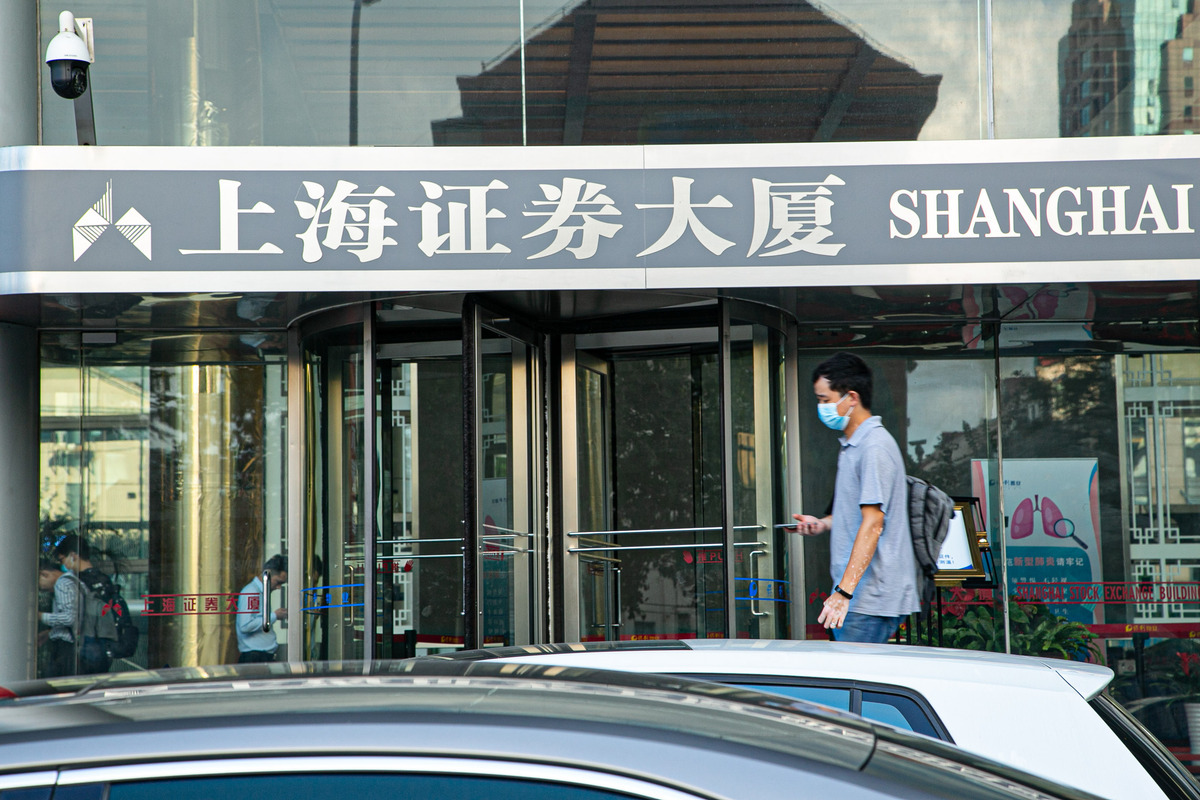 A pedestrian passes the Shanghai Stock Exchange on Aug 31. [Photo by Fan Jianlei/For China Daily]