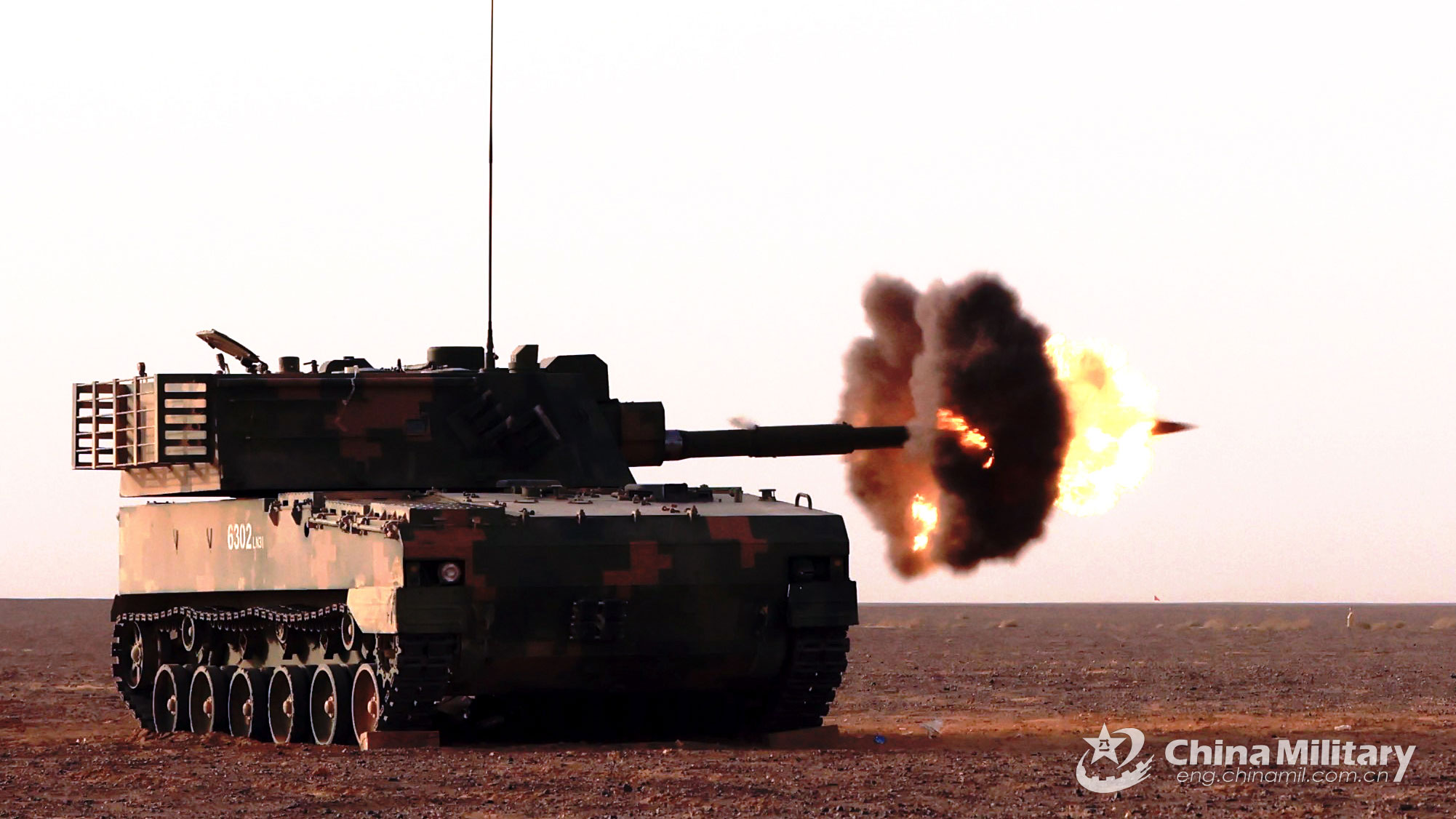 An armored vehicle attached to an artillery battalion of a combined arms brigade under the PLA 75th Group Army fires at the mock targets during a live-fire training exercise in the Gobi desert, Northwest China, in early June, 2021. (eng.chinamil.com.cn/Photo by Zhang Hongyu)
