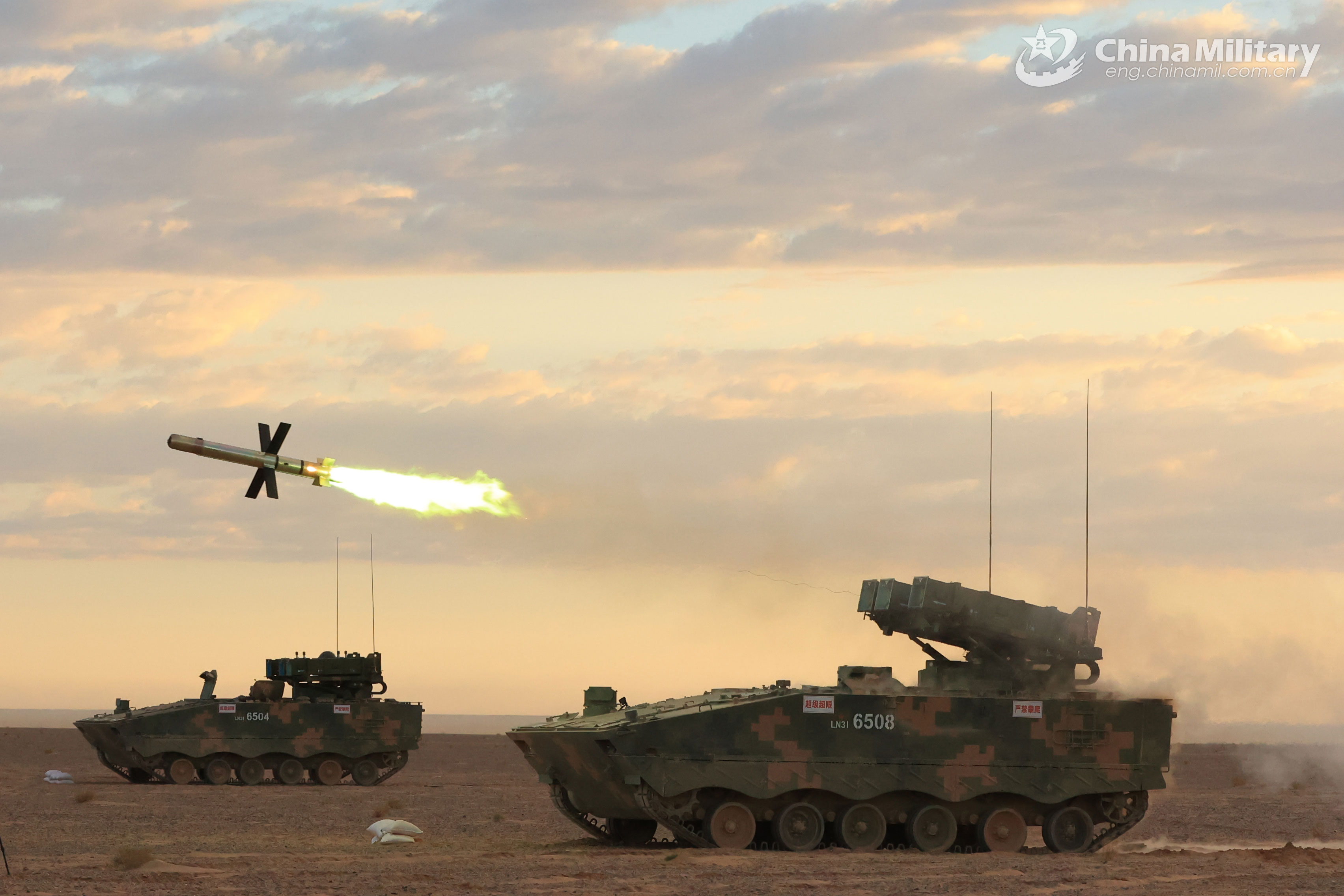 Armored vehicles attached to an artillery battalion of a combined arms brigade under the PLA 75th Group Army fire at the mock targets during a live-fire training exercise in the Gobi desert, Northwest China, in early June, 2021. (eng.chinamil.com.cn/Photo by Zhang Hongyu)