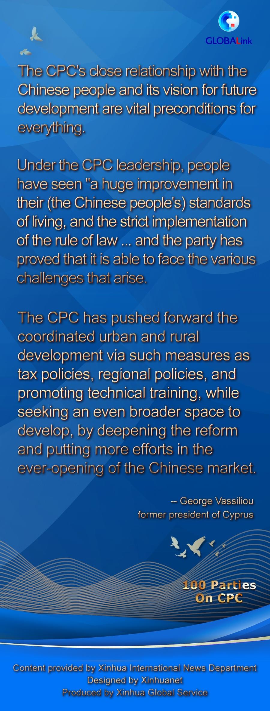 NICOSIA, June 16 (Xinhua) -- The Communist Party of China (CPC) has made brilliant achievements that were hard to attain in history, and will create new miracles in the time to come, George Vassiliou, former president of Cyprus, has said.