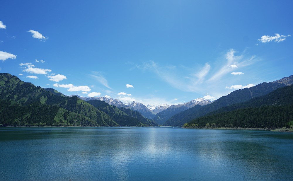 Photo taken on May 30, 2021 shows Taichi Lake, also known as the Heavenly Lake, situated within the Tianshan Mountains at the Tianchi Lake scenic area in Urumqi, northwest China's Xinjiang Uygur Autonomous Region. (People's Daily Online/Zhang Ruohan)