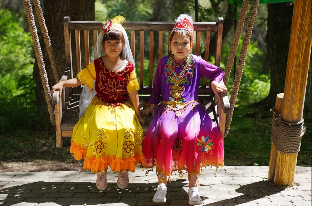 Two Kazakh girls dressed in traditional Kazakh costumes play on a swing at the Kazakh Folk Village within the Tianchi Lake scenic area in the Tianshan Mountains near Urumqi, northwest China's Xinjiang Uygur Autonomous Region, May 30, 2021. (People's Daily Online/Zhang Ruohan)