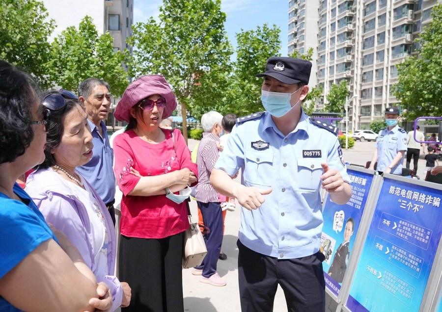 Photo taken on June 3, 2021 shows a police officer sharing information on how to identify and prevent telecom and internet fraud with local residents at a community in Shijiazhuang City of north China's Hebei Province. (Xinhua/Yang Shiyao)