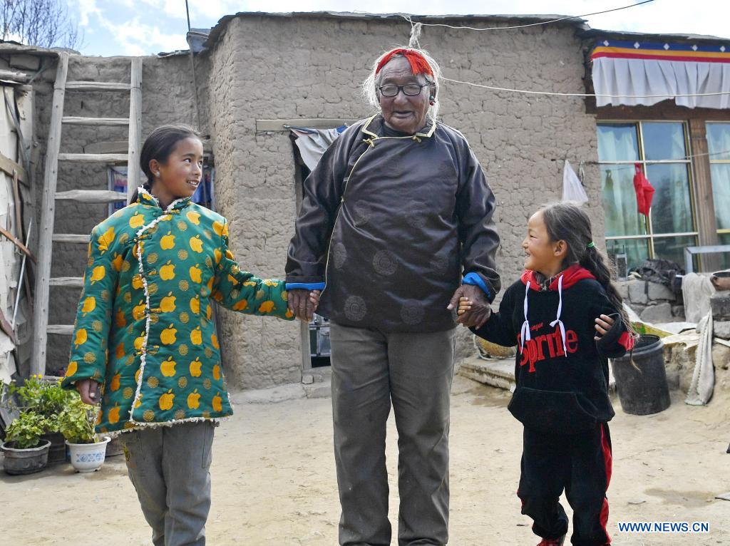 Sonam, hand in hand with two of his great granddaughters, goes for a walk at Xaga Village, Ema Township, Namling County, Xigaze City of southwest China's Tibet Autonomous Region, April 18, 2021. Sonam, 86, a resident of Xaga Village, started to do hard labor when he was 13 at a local manor, where, apart from babysitting the manor owner's children, he had to graze animals during the day and keep them fed over the night. He himself, however, did not have adequate food and clothing, and was forced to sleep with the animals at the sheepfold. "I had been verbally and physically abused so often that I simply went numb," Sonam recalled. Sonam was allocated with farmland, housing and livestock after the democratic reform in 1959. "I'm already a great grandfather now, enjoying a happy life with all my offspring," Sonam said. His first son, 62, is a member of the Communist Party of China (CPC) and a business leader at his village. They managed to refurbish their residence in 2013. Sonam said his life today was beyond "the wildest imagination" in his early years. (Xinhua/Zhang Rufeng)
