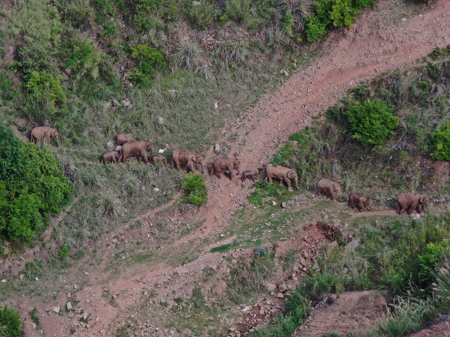 A herd of wild elephants walk in Yimen county, Yuxi, Yunnan province, on June 16, 2021. [Photo/YUXI PUBLIC SECURITY BUREAU]