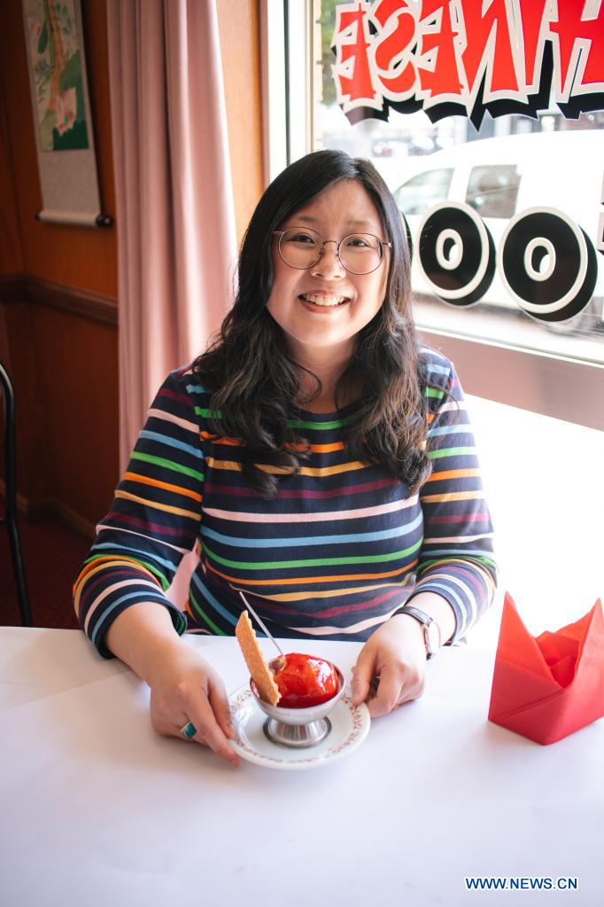 Jennifer Wong, hostess of "Chopsticks or Fork?", is about to sample deep fried ice cream at the New Bo Wa Restaurant in Moree in northern New South Wales, Australia on Oct. 21, 2020. (Photo by Lin Jie Kong/Hand out via Xinhua)