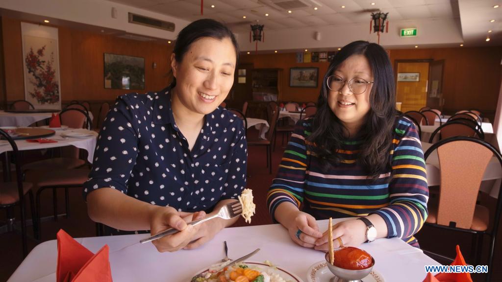 Lin Jie Kong (L), director of "Chopsticks or Fork?", and Jennifer Wong, hostess of the program, sample a dish at the New Bo Wa Restaurant in Moree in northern New South Wales, Australia, on Oct. 21, 2020. (Xinhua)