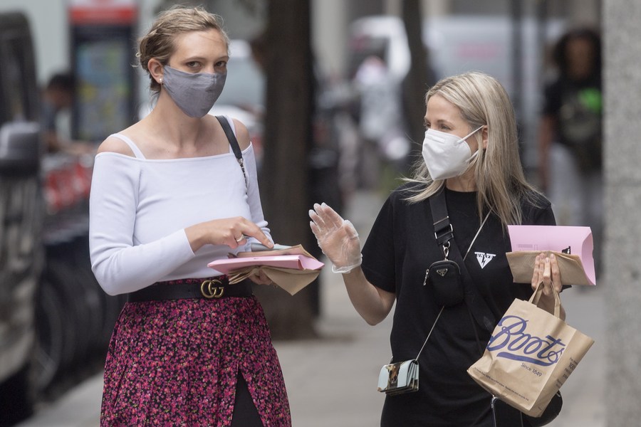 People wearing face masks talk on a street in London, Britain, June 17, 2021. (Photo by Ray Tang/Xinhua)