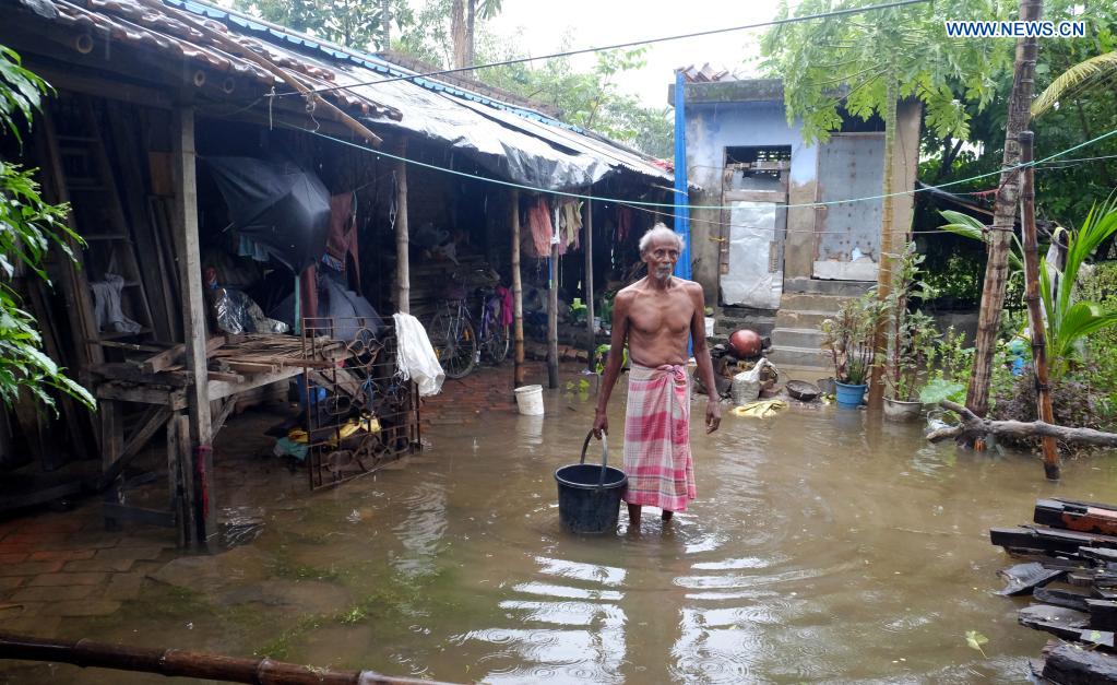 A resident stands in a water-logged area after a heavy rainfall in Kolkata, India, June 19, 2021. (Str/Xinhua)