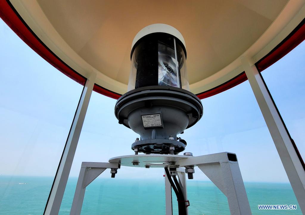 Photo taken with a mobile phone on June 19, 2021 shows the light powered by green energy inside the Chidingyu Lighthouse in Quanzhou, southeast China's Fujian Province. Chidingyu Lighthouse, located at the key turning point of the inner route on the west side of the Taiwan Strait, was officially put into operation on Saturday. It is powered by green energy and covers a light range of more than 15 nautical miles. The lighthouse is equipped with modern navigation devices which meet the needs of different kinds of ships in and out of Quanzhou Bay. (Xinhua/Wei Peiquan)