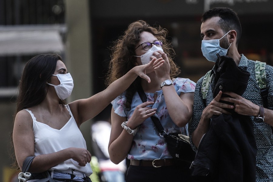 People wearing face masks are seen amid the COVID-19 outbreak in Sao Paulo, Brazil on May 29, 2021. (Photo by Rahel Patrasso/Xinhua)