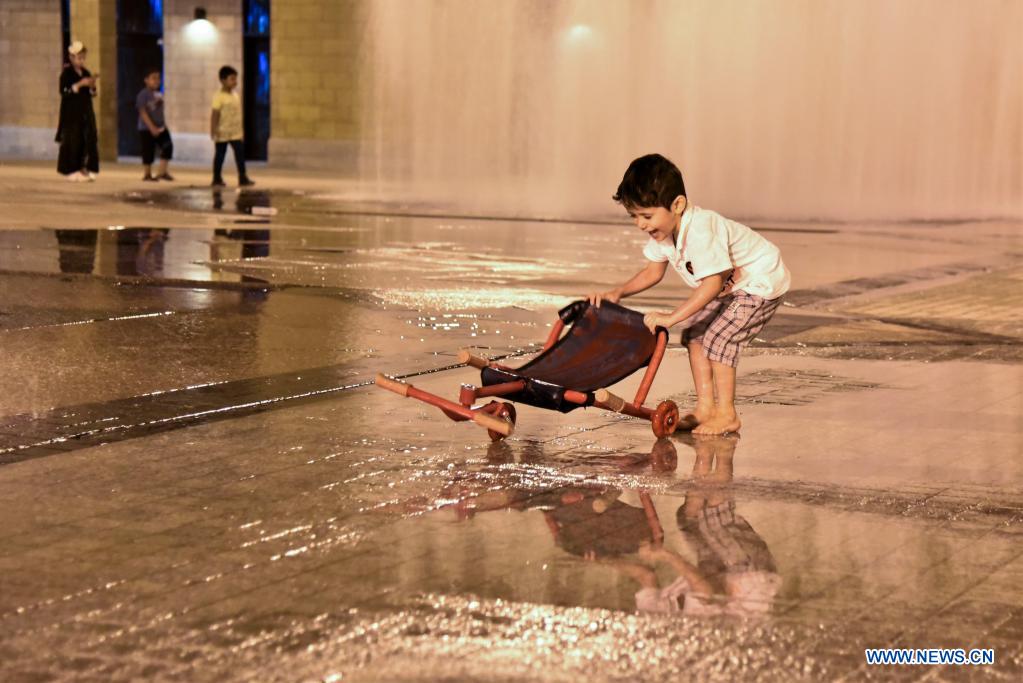 A child plays at a splash pad on a hot night in Riyadh, Saudi Arabia, on June 20, 2021. (Xinhua/Wang Haizhou)