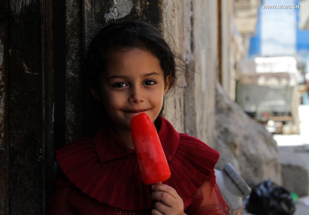 A Palestinian refugee child has a popsicle in Jabalia refugee camp in the northern Gaza Strip, on June 20, 2021, World Refugee Day. (Photo by Rizek Abdeljawad/Xinhua)