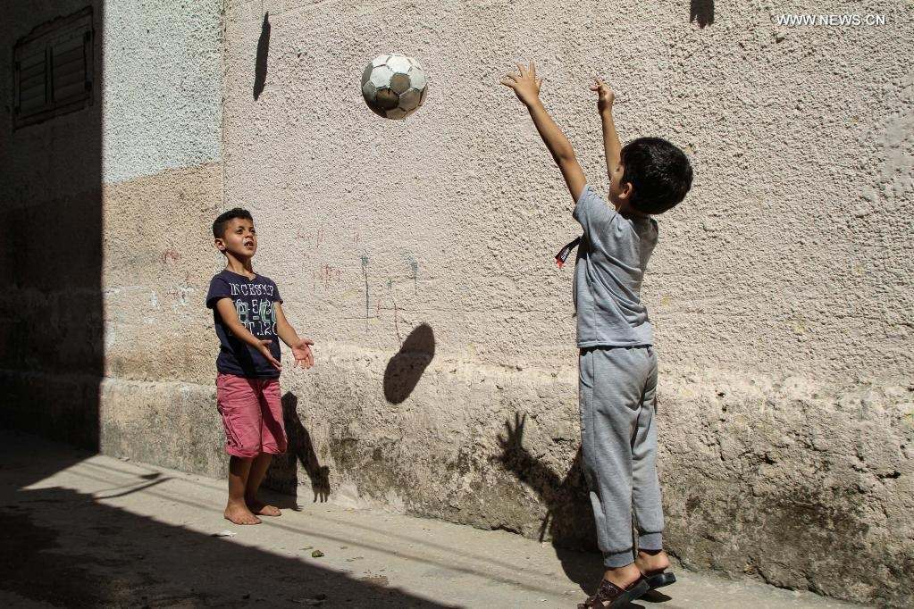 Palestinian refugee children play in Jabalia refugee camp in the northern Gaza Strip, on June 20, 2021, World Refugee Day. (Photo by Rizek Abdeljawad/Xinhua)