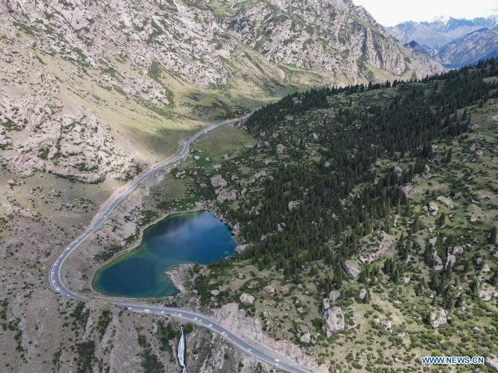 Aerial photo taken on June 20, 2021 shows the scenery along Duku Highway in northwest China's Xinjiang Uygur Autonomous Region. Duku Highway, deemed one of China's most beautiful roads, recently opened to tourists after completing its yearly "hibernation." The 560-km highway, connecting Dushanzi in the northern area of Xinjiang Uygur Autonomous Region and Kuqa County in the south, runs through various landscapes including glaciers, forests, and grasslands. Due to snowy weather and road icing, the Duku Highway has a "hibernation period", which generally begins in October and ends in June of the following year. (Xinhua/Gao Han)