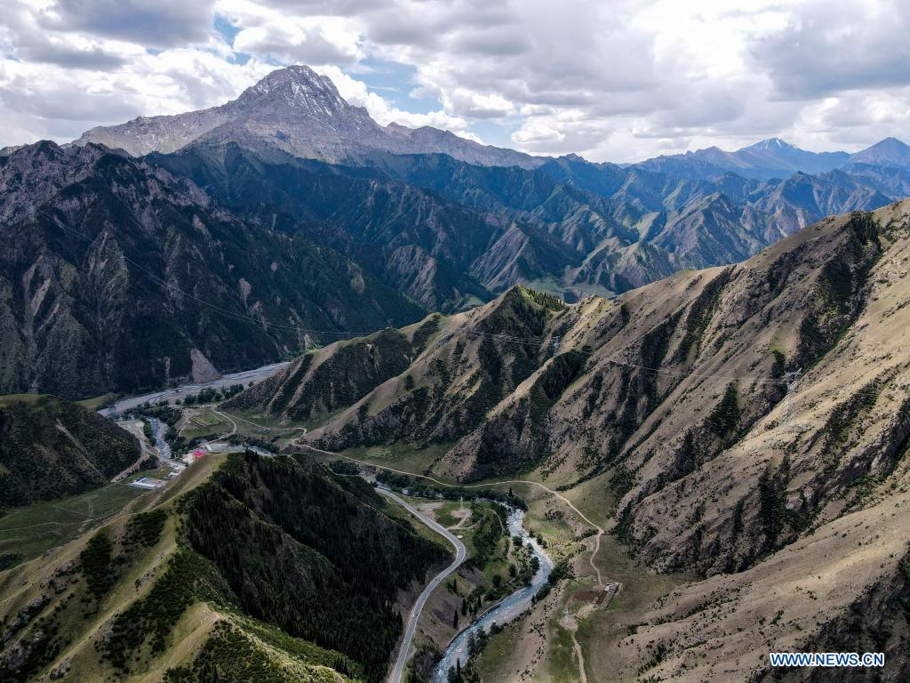 Aerial photo taken on June 20, 2021 shows the scenery along Duku Highway in northwest China's Xinjiang Uygur Autonomous Region. Duku Highway, deemed one of China's most beautiful roads, recently opened to tourists after completing its yearly "hibernation." The 560-km highway, connecting Dushanzi in the northern area of Xinjiang Uygur Autonomous Region and Kuqa County in the south, runs through various landscapes including glaciers, forests, and grasslands. Due to snowy weather and road icing, the Duku Highway has a "hibernation period", which generally begins in October and ends in June of the following year. (Xinhua/Gao Han)