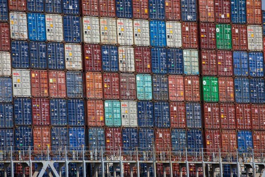 Containers on a container ship are seen as it travels in the New York Harbor, the United States, on May 20, 2021. (Photo by Michael Nagle/Xinhua)