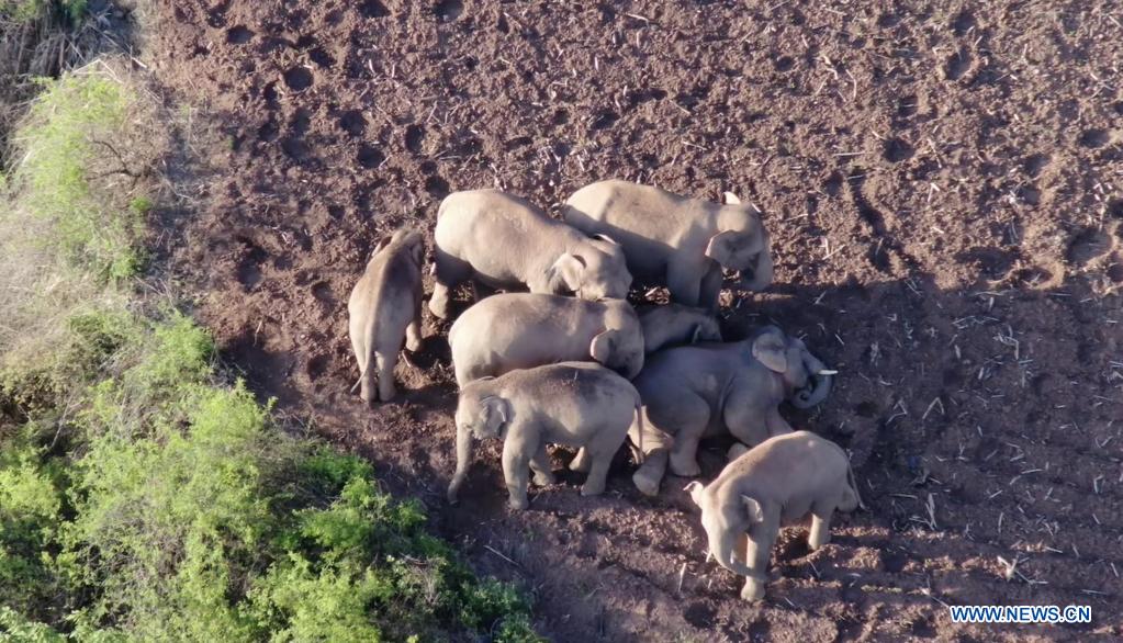Screen grab from drone video shows the Asian elephants in Eshan County of Yuxi, southwest China's Yunnan Province on June 20, 2021. China's herd of 14 wandering wild Asian elephants has traveled further north, re-entering Shijie Township in Yimen County, in southwest China's Yunnan Province, authorities said on Monday. (Xinhua)