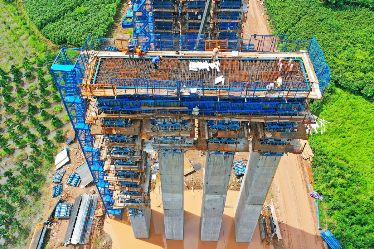 Workers construct a railway bridge on the Hangzhou-Wenzhou high-speed railway line in Taizhou, Zhejiang province. [Photo by Wang Huabin/For China Daily]