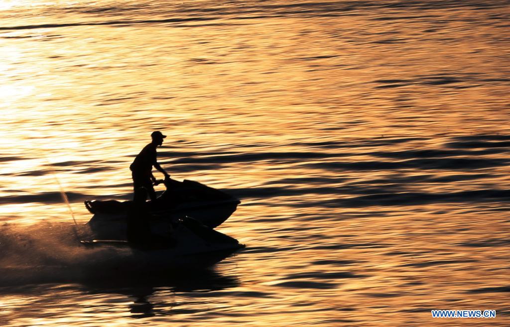 An Iraqi youth enjoys jet-skiing on the Tigris River during sunset in Baghdad, Iraq, on June 21, 2021. (Xinhua/Khalil Dawood)
