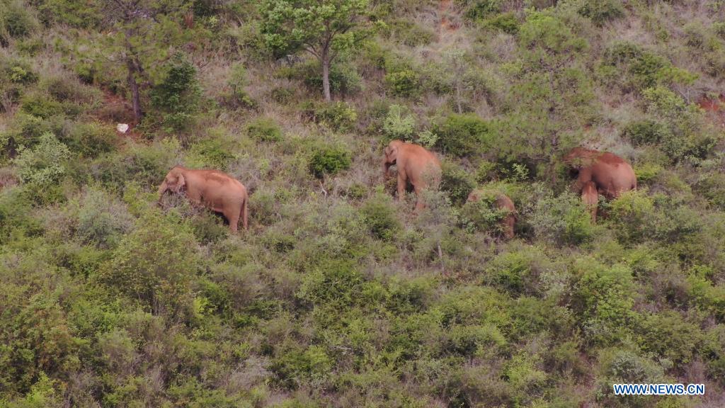 Screen grab from drone video shows the Asian elephants in Dalongtan Township, Eshan County of Yuxi City, southwest China's Yunnan Province on June 22, 2021. The herd of 14 wandering wild Asian elephants has traveled southwards, re-entering Eshan County, in southwest China's Yunnan Province, authorities said on Tuesday. The herd headed 11.2 kilometers south between 6 p.m. (1000 GMT) on Monday and the same time on Tuesday. (Xinhua)
