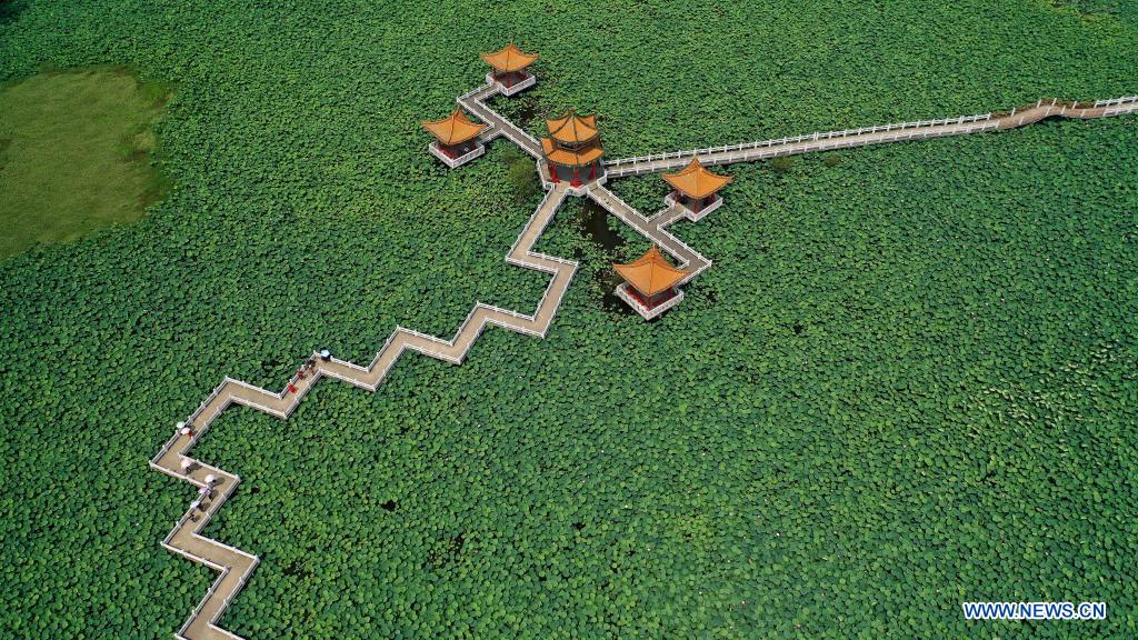 Aerial photo taken on June 22, 2021 shows visitors enjoying lotus flowers at a scenic area in Anlong County, southwest China's Guizhou Province. (Photo by Liu Chaofu/Xinhua)