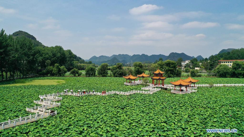 Aerial photo taken on June 22, 2021 shows visitors enjoying lotus flowers at a scenic area in Anlong County, southwest China's Guizhou Province. (Photo by Liu Chaofu/Xinhua)