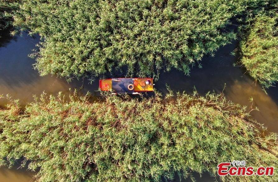 Tourists take a boat going through a "reed maze" in a lake at Gaoyou, Jiangsu Province, June 22,2021. Reeds divide the lake water into winding lanes, making the Gaoyou Lake look like a "maze." (Photo: China News Service /Yang Bo)