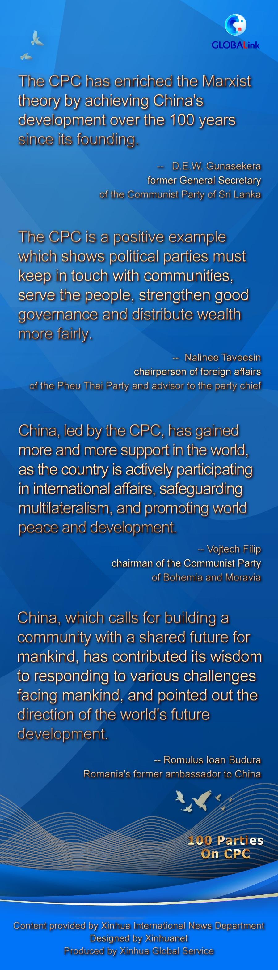 BEIJING, June 23 (Xinhua) -- As this year marks the 100th anniversary of the Communist Party of China (CPC), many foreign officials have spoken highly of the great strides the CPC has made in the development of China and the world at large.