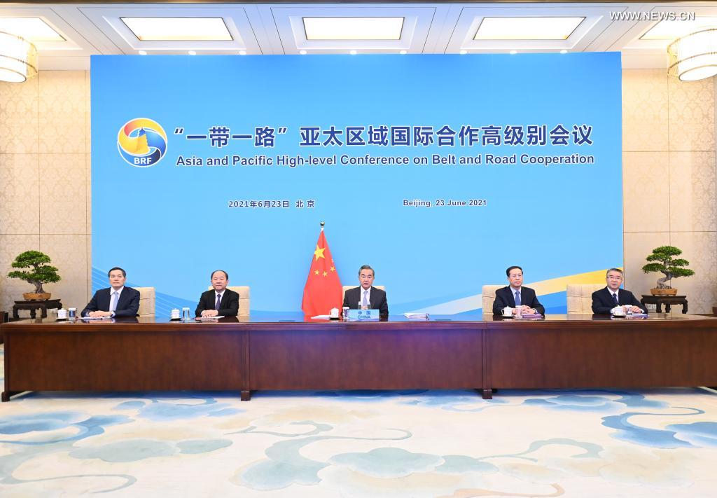 Chinese State Councilor and Foreign Minister Wang Yi presides over the Asia and Pacific High-level Conference on Belt and Road Cooperation via video link in Beijing, capital of China, June 23, 2021. (Xinhua/Li Xiang)