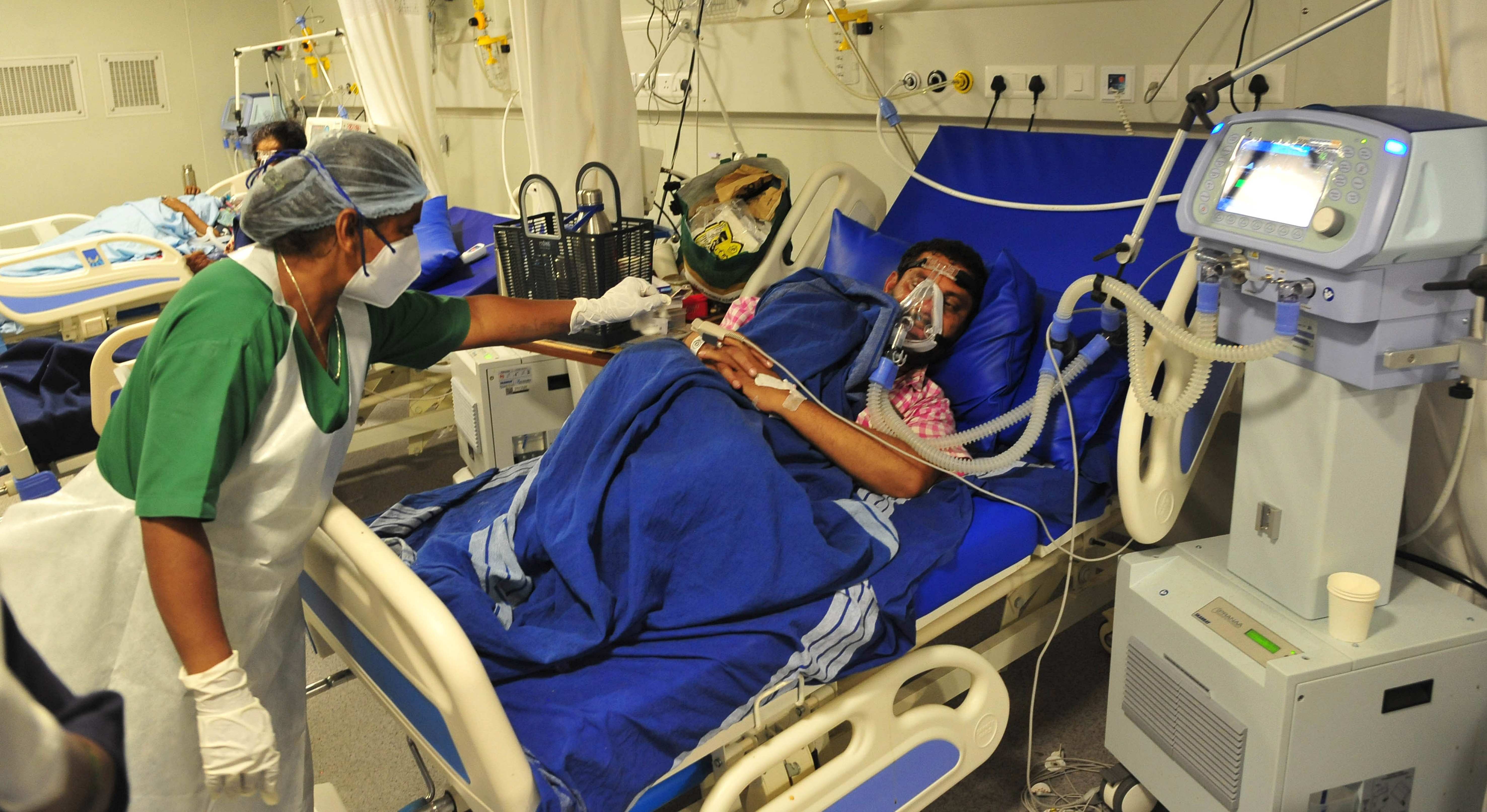 Patients receive treatment in a COVID-19 ward of a hospital in Bangalore, India, April 30, 2021. (Str/Xinhua)