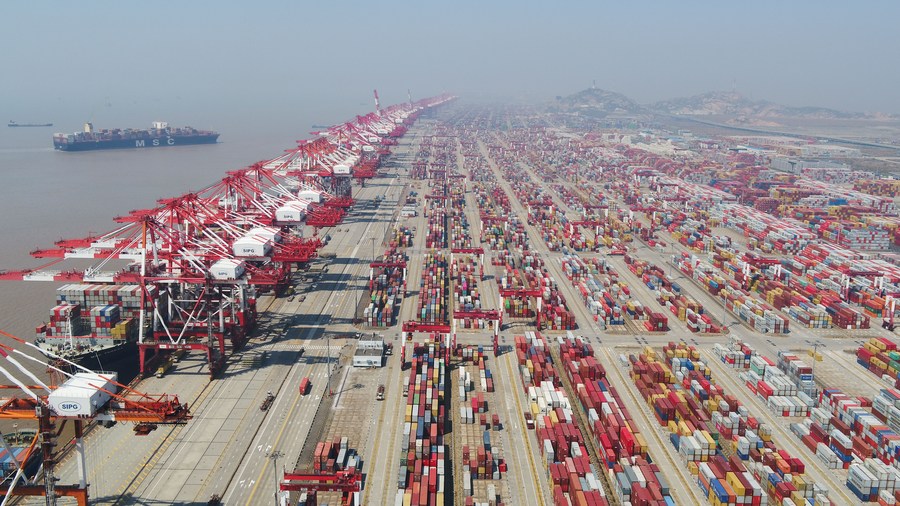 Aerial photo taken on March 18, 2020 shows the container dock of Shanghai's Yangshan Port, east China. (Xinhua/Ding Ting)