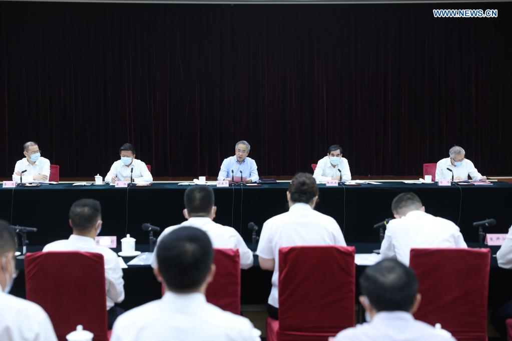 Chinese Vice Premier Hu Chunhua, also a member of the Political Bureau of the Communist Party of China Central Committee, attends a symposium on high-skilled talent in Beijing, capital of China, June 23, 2021. (Xinhua/Liu Bin)