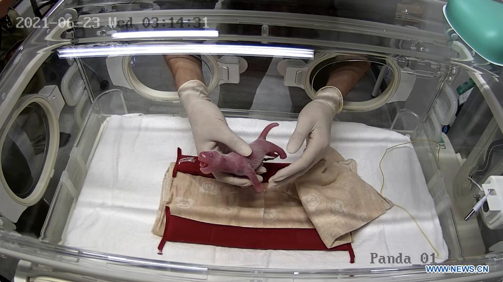 A staff member takes care of a giant panda cub in an incubator at the Ueno Zoological Gardens in Tokyo, Japan, June 23, 2021. Popular giant panda Shin Shin has given birth to twin cubs at the Ueno Zoological Gardens in Tokyo, her first delivery in four years, local media reported Wednesday. (Tokyo Zoological Park Society/Handout via Xinhua)