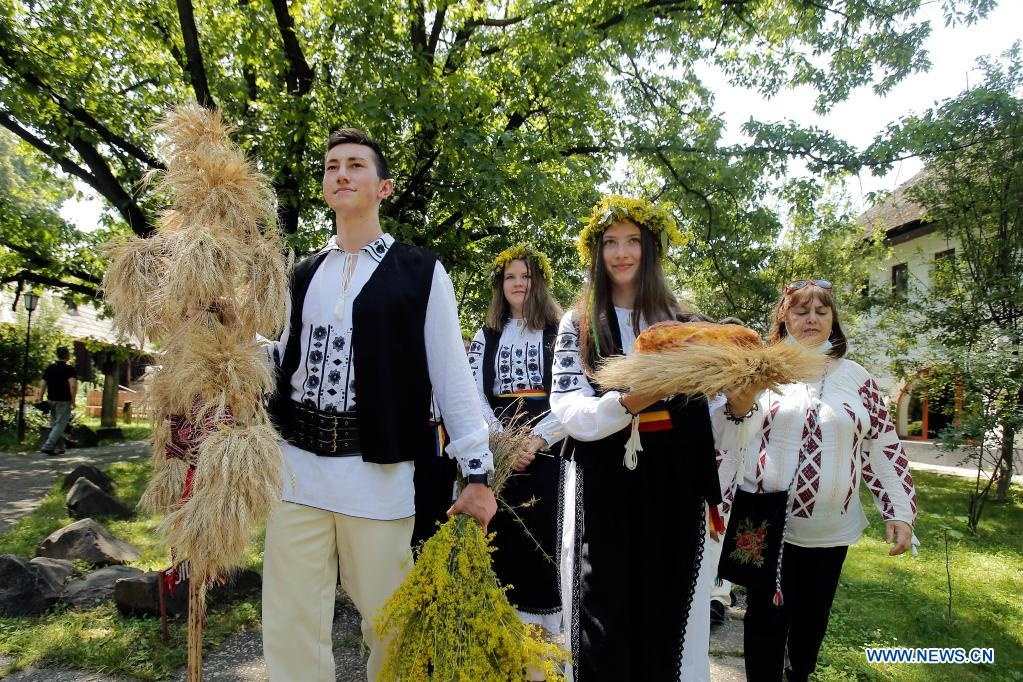 Performers are seen during a Midsummer Day celebration at Village Museum in Bucharest, Romania, on June 24, 2021. (Photo by Cristian Cristel/Xinhua)
