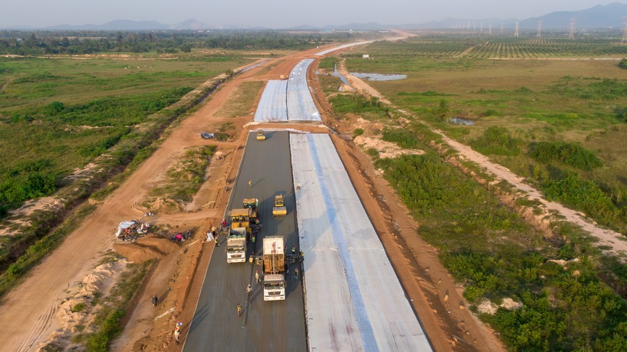 Aerial photo taken on Nov. 15, 2020 shows the construction site of the first expressway in Cambodia in Kampong Speu Province, Cambodia. (Photo by Li Zhen/Xinhua)