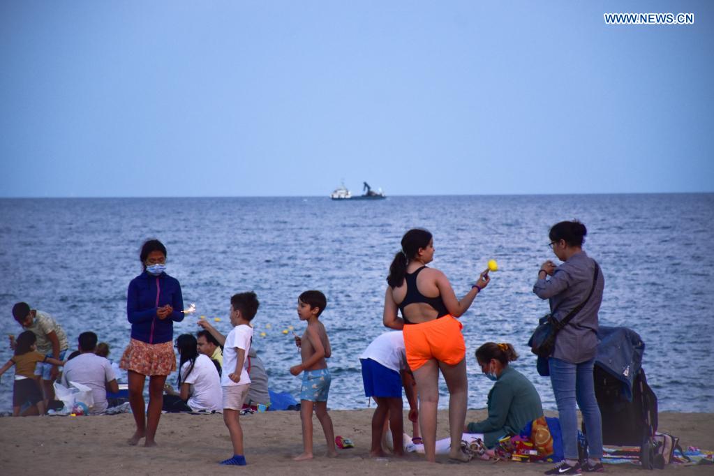 People have fun at a beach in Barcelona, Spain, on June 23, 2021. San Juan's night, a traditional festival in Catalonia of Spain, fell on Wednesday. Local residents usually enjoy themselves all night long with fireworks and feasts on beaches. (Photo by Qing Shenglan/Xinhua)