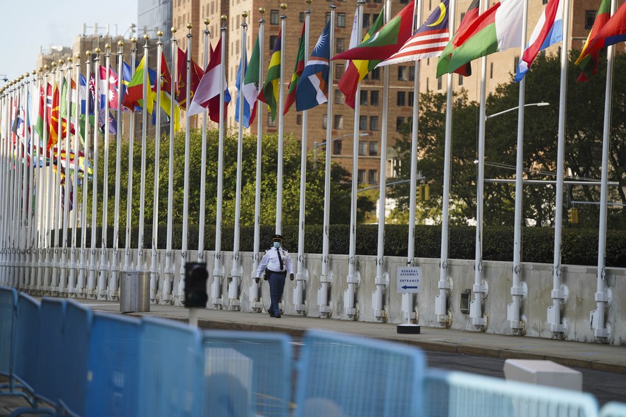 A security guard patrols at the United Nations headquarters in New York, Sept. 22, 2020. (Xinhua/Wang Ying)