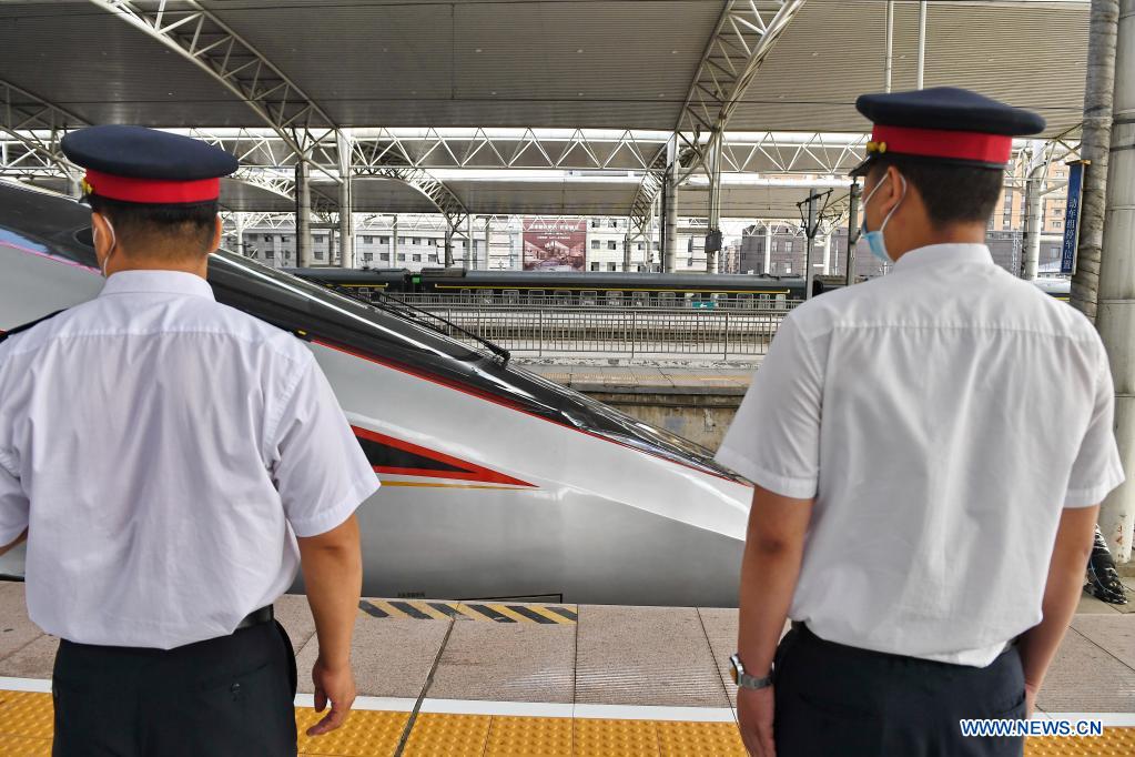 Staff prepare to board Train G916, a Fuxing intelligent bullet train, at Changchun Railway Station in Changchun, northeast China's Jilin Province, June 25, 2021. The Fuxing intelligent bullet trains were put into operation on some railway lines on Friday. (Xinhua/Zhang Nan)