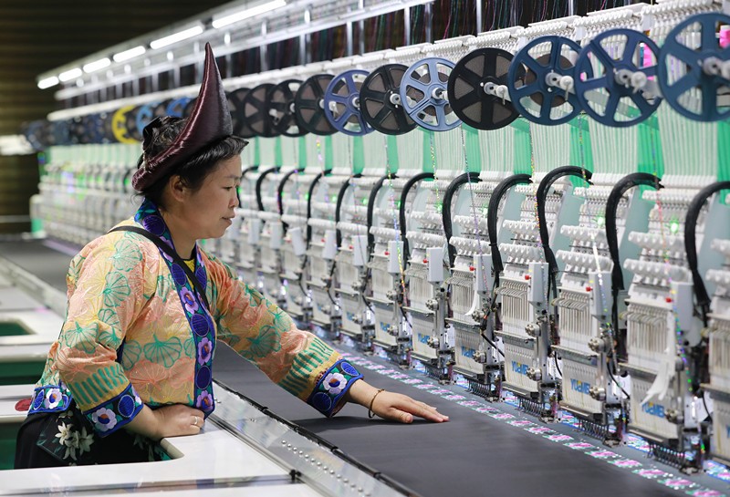 A woman checks the operation of an embroidery machine at a workshop of a poverty alleviation relocation site in Congjiang county, southwest China's Guizhou province, March 26, 2021. (People's Daily Online/Luo Jinglai)