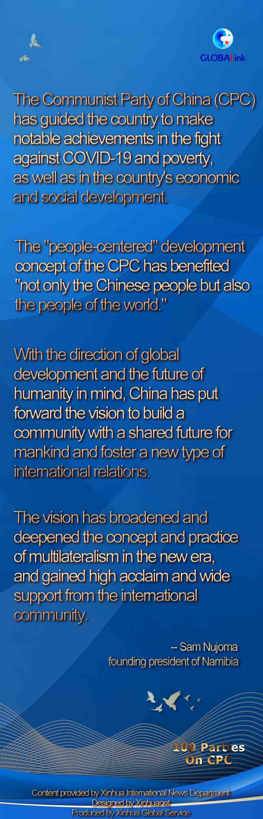 The 92-year-old Namibian veteran politician said China has been among the world's fastest-growing economies, and the CPC has guided the country to make notable achievements in the fight against COVID-19 and poverty, as well as in the country's economic and social development.