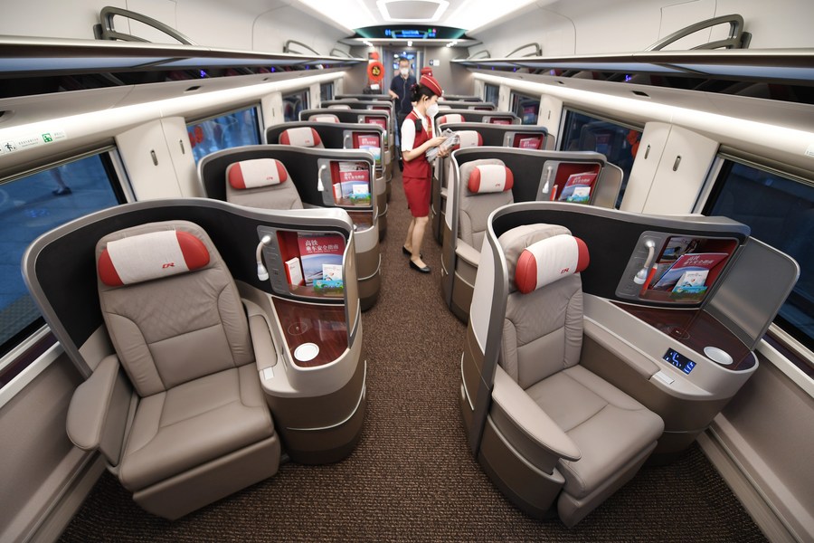 Photo taken on June 25, 2021 shows passenger seats in a business car on train G5, a Fuxing intelligent bullet train. (Xinhua/Zhang Chenlin)
