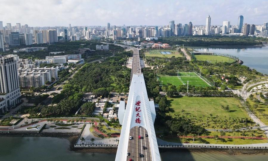 Aerial photo taken on May 3, 2021 shows a bridge in Haikou, capital of south China's Hainan Province. (Xinhua/Yang Guanyu)
