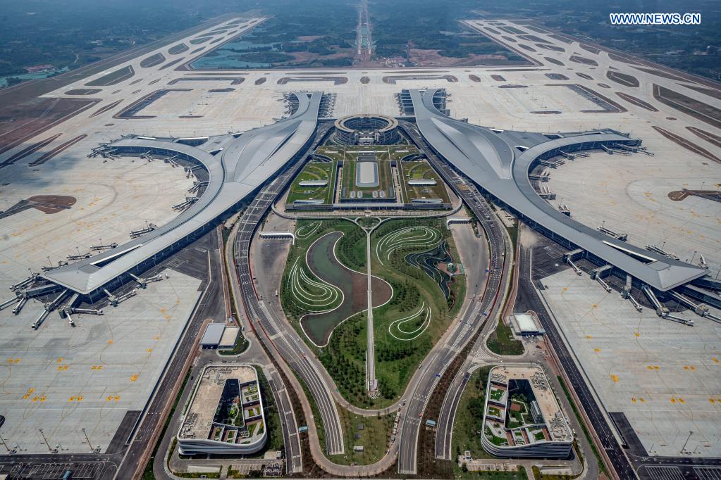 Aerial photo taken on May 31, 2021 shows the Chengdu Tianfu International Airport in Chengdu, southwest China's Sichuan Province. Chengdu Tianfu International Airport in southwest China's Sichuan Province has opened for operations, with a Sichuan Airlines flight bound for Beijing taking off on Sunday morning. (Photo by Liu Yinghua/Xinhua)