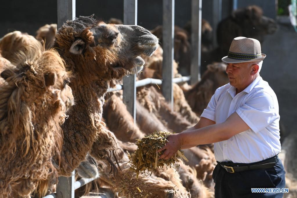 A man feeds camels at an organic cultivation base of a dairy company in Yining county in Kazak autonomous prefecture of Ili, Northwest China's Xinjiang Uygur autonomous region, May 27, 2021. (Photo/Xinhua)