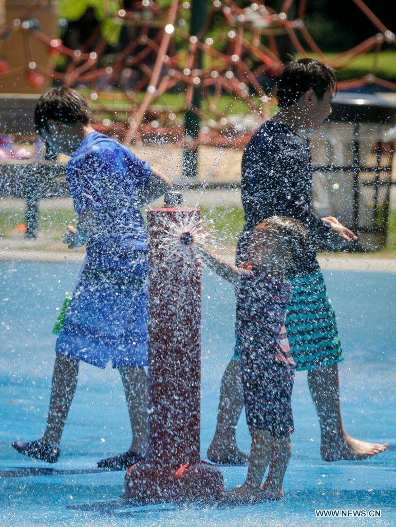 Children play at a water park in Vancouver, British Columbia, Canada, on June 27, 2021. Heat wave continued affecting British Columbia on Sunday. (Photo by Liang Sen/Xinhua)