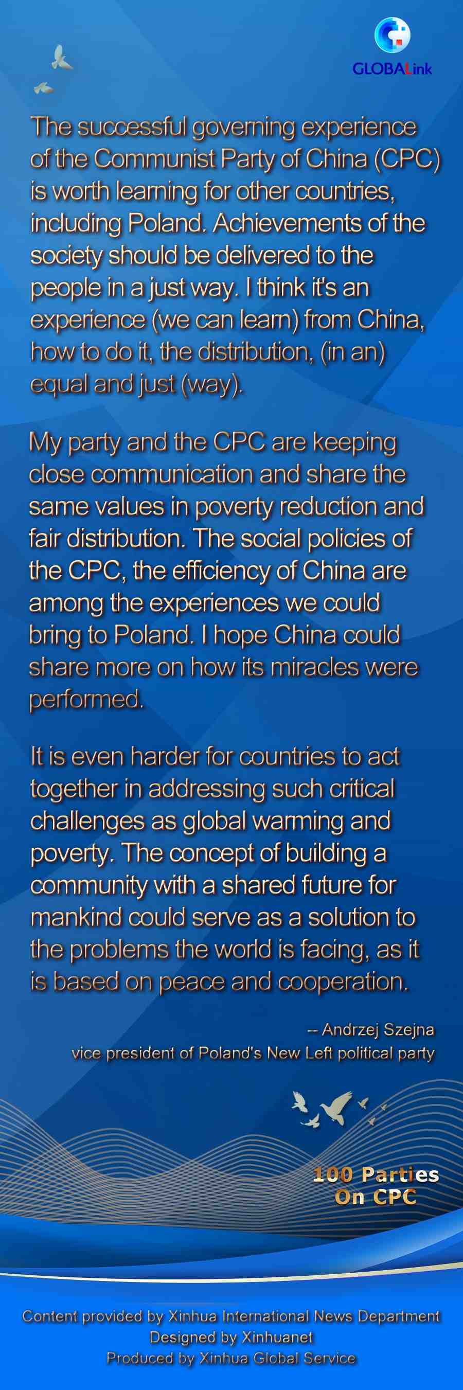 Hailing the excellent relationship between the CPC and the New Left, Szejna said that on the eve of the CPC's 100th anniversary, he would like to wish the Chinese people a better and happier life.